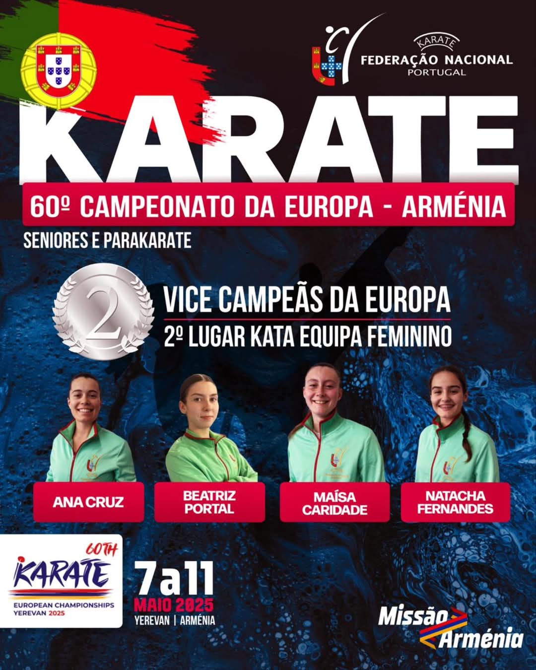 A equipa portuguesa de Kata Feminino composta pelas atletas Ana Cruz, Beatriz Portal, Maísa Caridade e Natacha Fernandes consegue mais um feito para Portugal com a conquista da medalha de prata no 60° Campeonato Europeu de Seniores e Parakarate realizado em Yerevan – Arménia.