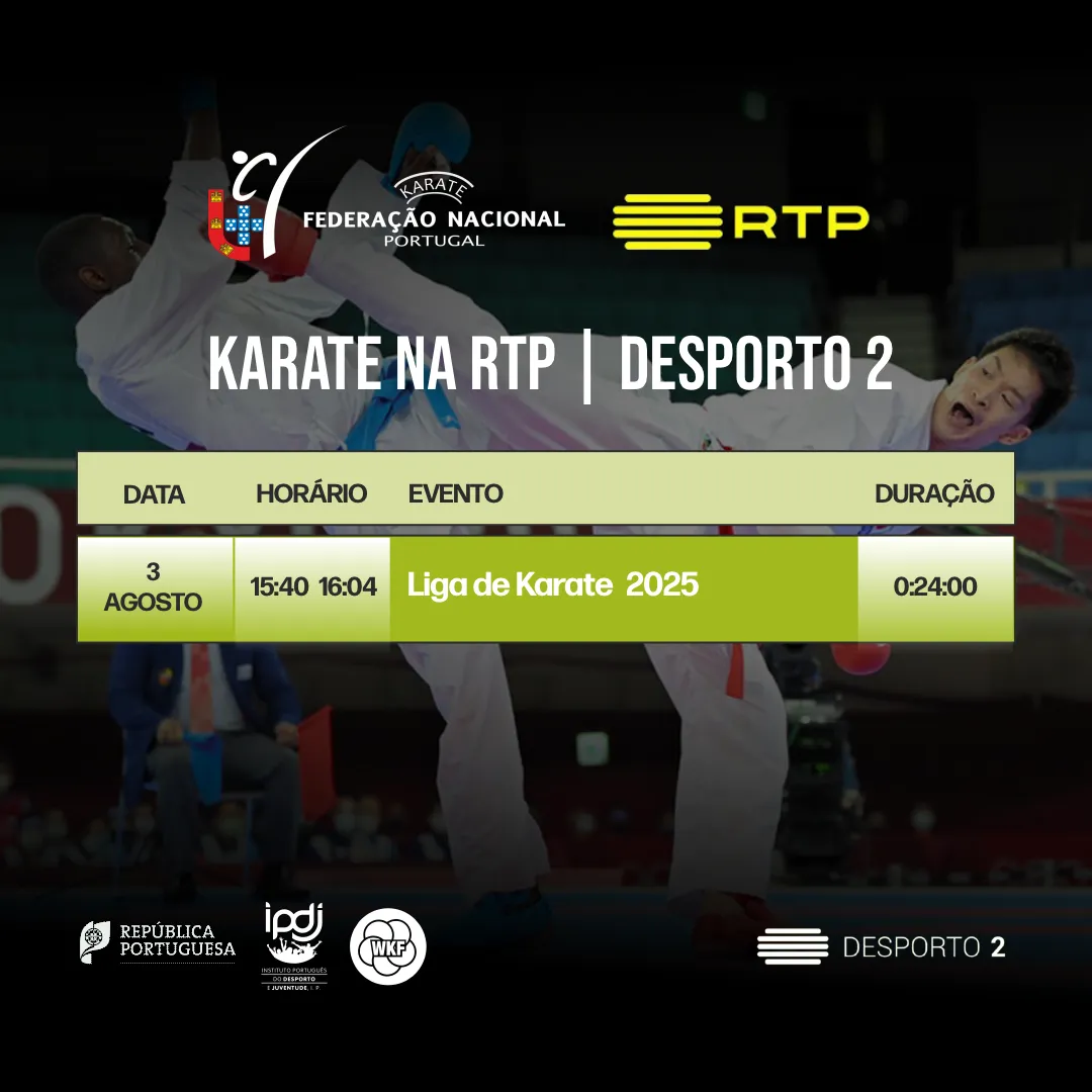 Dado o recente acordo com a RTP para a transmissão dos nossos eventos federativos, irá ser transmitida a Liga de Karate, realizada em Gondomar, no próximo domingo, 3 de Agosto de 2025, conforme grelha da RTP 2 – Desporto 2 a ser transmitida: